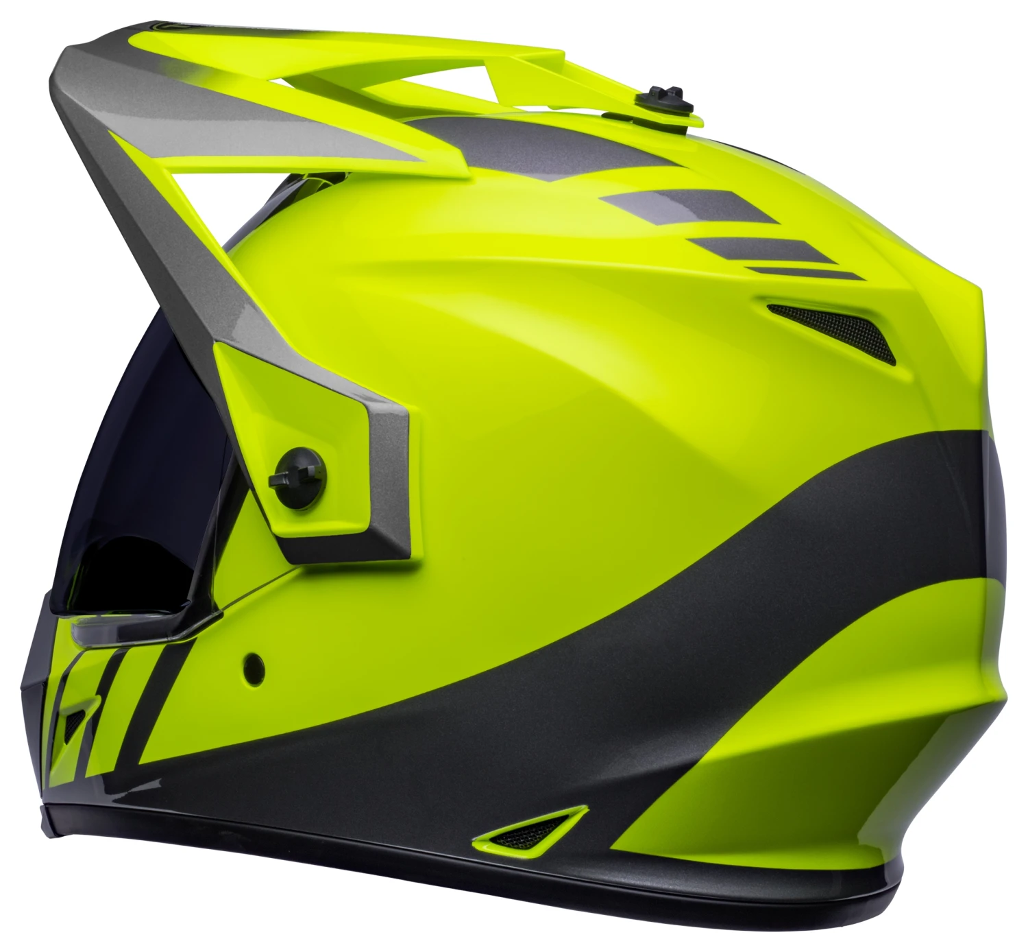 The MX-9 ADV helmet can also transform into a more streetable helmet by removing the peak visor. Included side pods replace the visor where it mounts to the helmet, giving you sleek top-gun styling. When you hit the dirt and need the added protection of a pair of goggles, simply flip up the shield and throw ’em on. The MX-9 is designed to work with any dirt goggle out there.