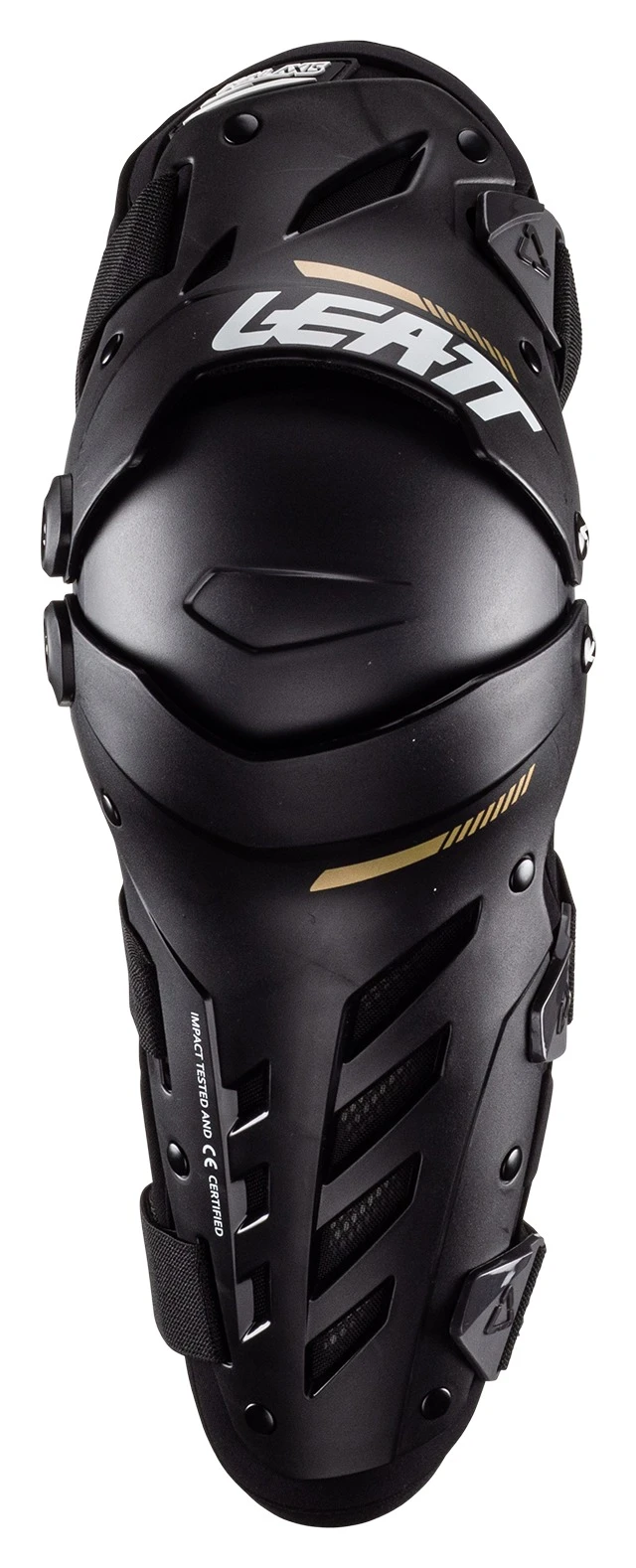 The Leatt Dual Axis knee and shin guards are comfortable, well-ventilated protectors with two pivot points that allow them to more accurately bend with the knee’s natural movement. They cover the knee, even when fully bent, as well as the lower thigh and most of the lower legs. Great levels of impact protection are proven by the CE impact safety standard they are certified to. They are also certified to CE’s abrasion resistance safety standard. The strap buckles are low profile with no edges to hang up on your riding pants. Straps are also backed by soft, comfortable, vented airprene material that resists slipping. Lighter weight, comfortable and offers more freedom of movement than almost any other CE certified protection system.