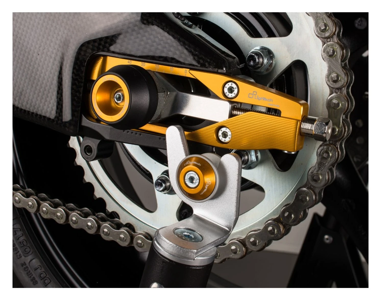 - Optional LighTech Chain Adjuster Lifters available which allows you to use spool-type rear stands for a more secure lift (sold separately)
